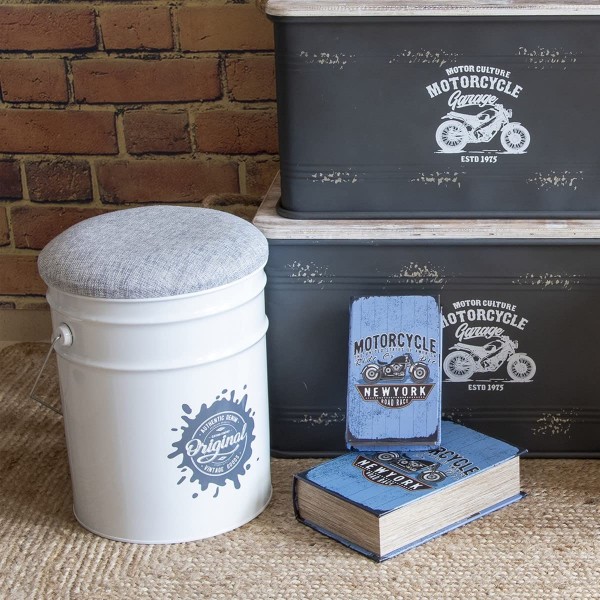 Tabouret Fût et Coffre de Rangement métal, Modèle Blanc, Collection Industrielle, Hauteur 40 cm