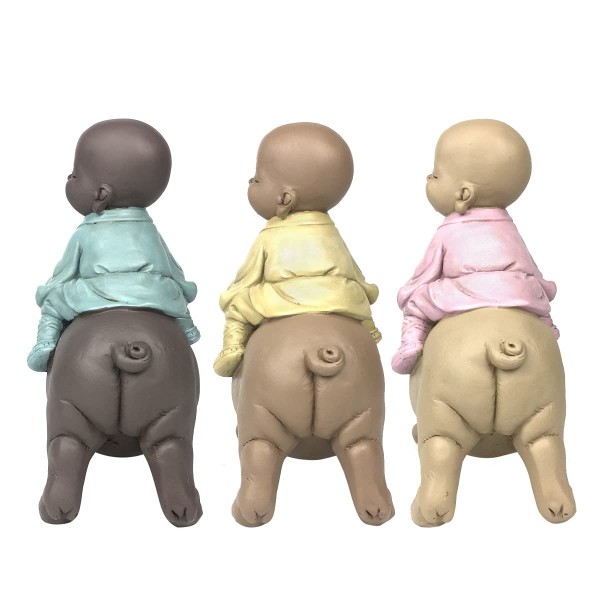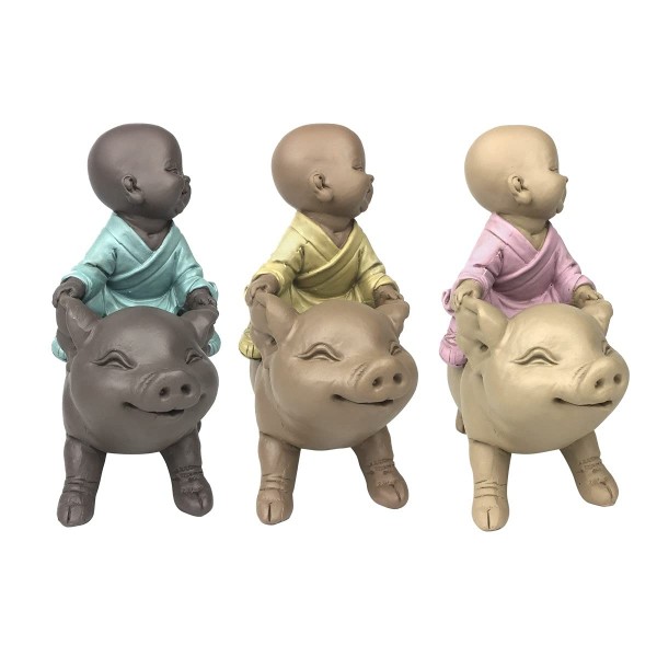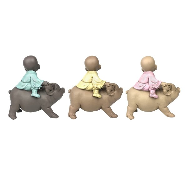 Verre Cadeaux Figurine Résine Enfant Bouddhiste sur Cochon x3 Couleurs 13 cm