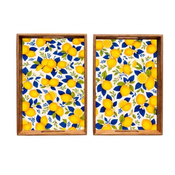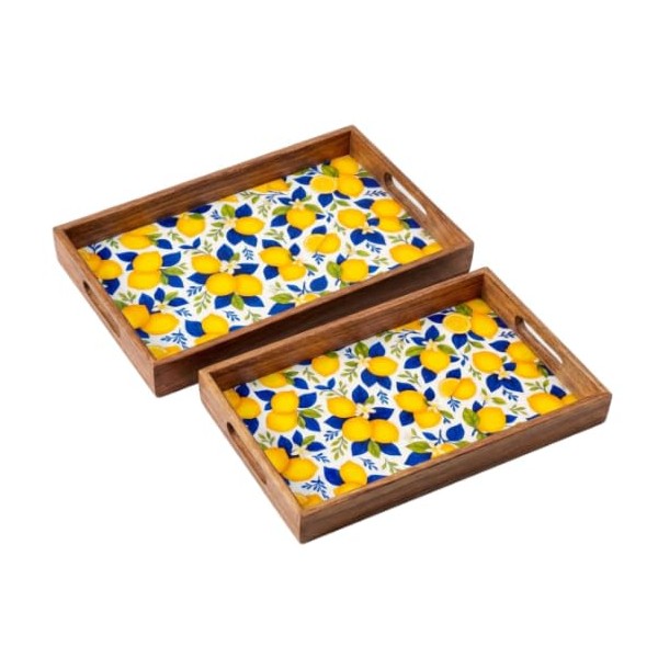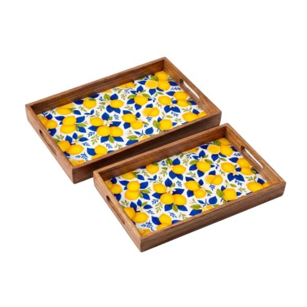 Lot de 2 Plateaux de Service Motif Citrons – Bois & Résine – Décor Agrumes Jaune & Bleu – Grand 42,5 x 27 x 5 cm