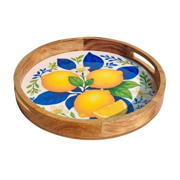 Plateau Rond de Service Motif Citrons – Bois & Résine – Décor Agrumes Jaune Bleu – Ø 35 cm – Épaisseur 4,5 cm