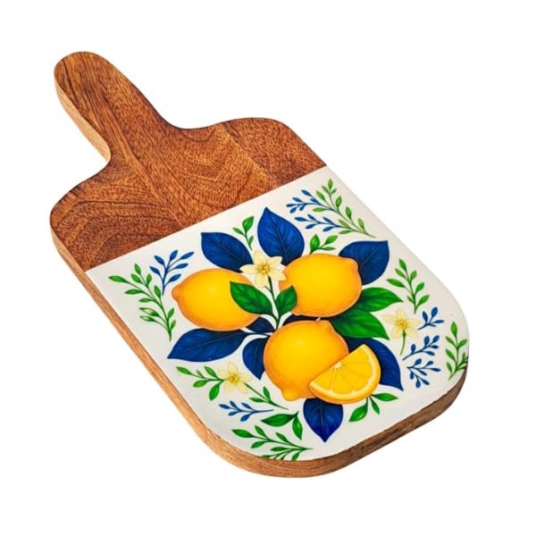 Planche à Découper Motif Citrons – Bois de Manguier & Résine – 30 x 15 cm – Décor Agrumes Jaune Bleu – Collection HappyDko