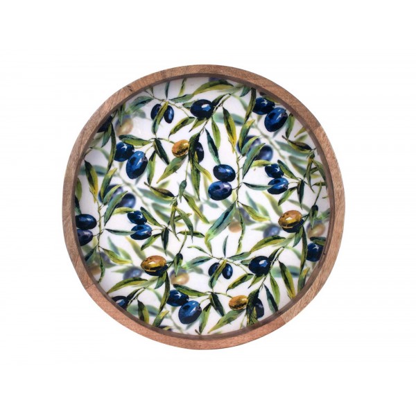 Plateau de service rond en bois de manguier et olives, diamètre 35 cm