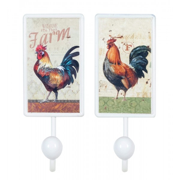 Set 2 patères rétros : Deux Coqs colorés, H 18,50 cm
