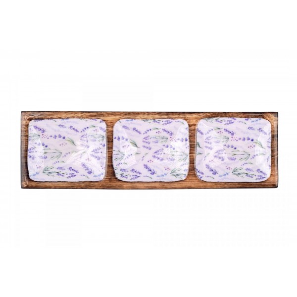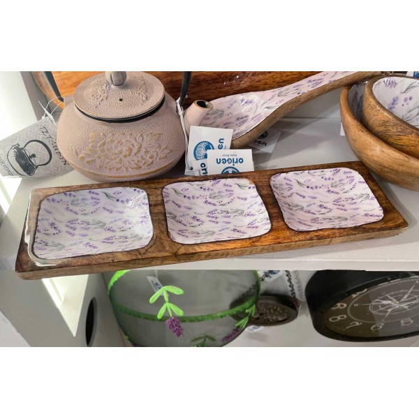 SIGNES GRIMALT Plateau Apéritif 3 compartiments en Bois de Manguier, Modèle Lavande en fleur, longueur 36 cm.