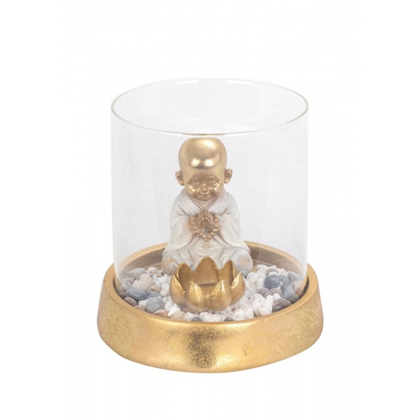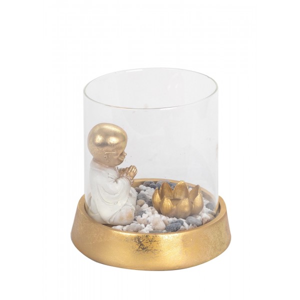 Bougeoir Cylindre en Vere et Figurine Bouddha Zen, Collection Lotus Blanc, Hauteur 18 cm