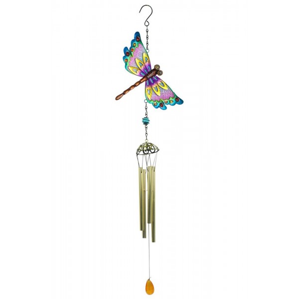Carillon libellule paré de jolies couleurs en métal et verre, hauteur 95 cm.