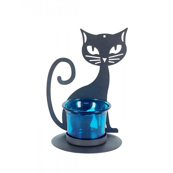 Le Bougeoir Chat, Structure Métal & Verrine, Bleu, Hauteur 14 cm
