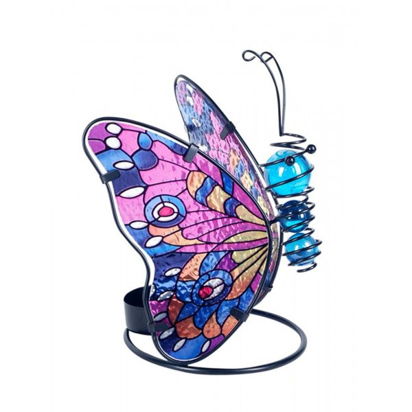 Photophore Papillon Violet, Métal et Verre, Effet Vitrail, H 12,5 cm