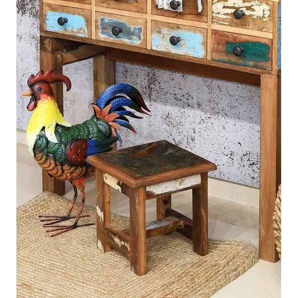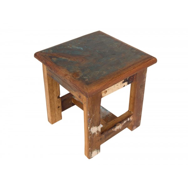 Tabouret Vintage en Bois Exotique, Collection Sinaloan, Aspect Bois Vieilli et décapé, H 28 cm