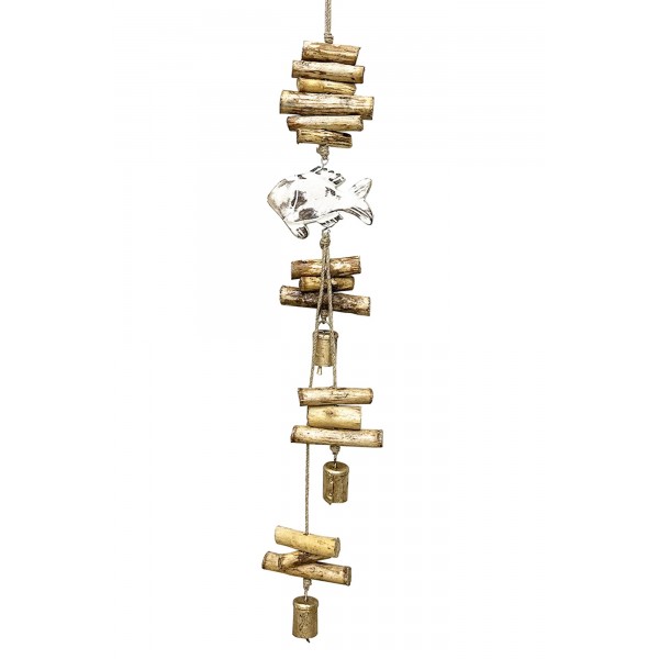 SIGNES GRIMALT Suspension Marine : Poisson blanc, Bois flotté et Cloches en laiton, 50 x 13 x 10 cm