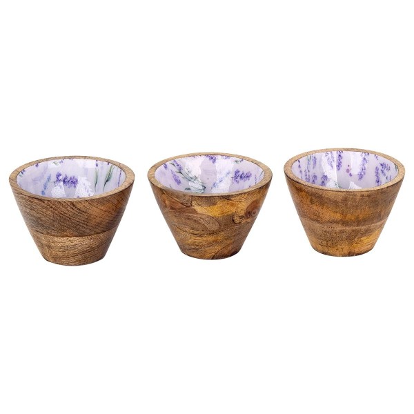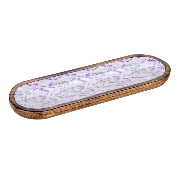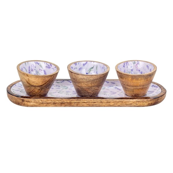 Plateau Apéritif Bords arrondis et 3 Bols en Bois de Manguier, Motif Lavande Florale, Longueur 38 cm