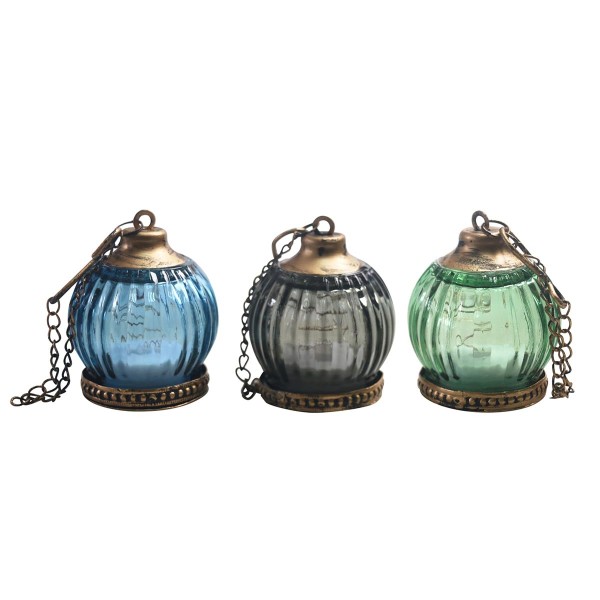 Set 3 bougeoirs en Verre coloré à Suspendre, collerettes Laiton et Ambiance Ethnique, diamètre 6,5 cm et Hauteur 8 cm