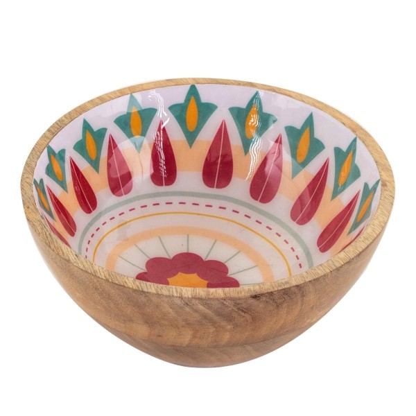 SIGNES GRIMALT Bol en Bois de Manguier, Thème Amérique du sud, Fleurs stylisées et picturales, diamètre 15 cm