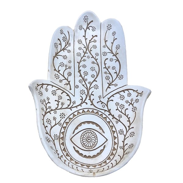 Plat Main de Fatima Porte-Bonheur Oriental à Poser, Composition résine et Couleurs Marron et Blanc, Longueur 25 cm