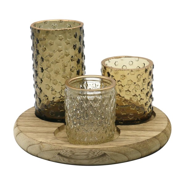 Porte-Bougies Bougeoir 3 cylindres en Verre fumé et Socle en Bois Clair veiné, diamètre 18 cm