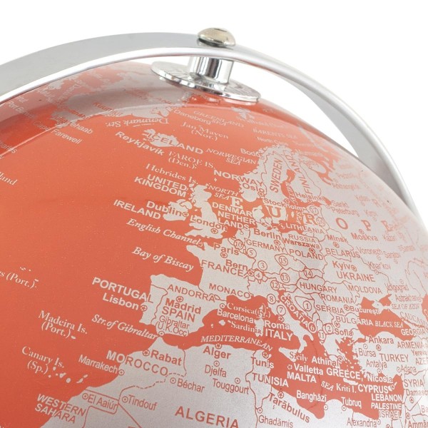 Mappemonde élégante en PVC et métal, socle en métal laiton, Argent et Corail, diamètre 26 cm