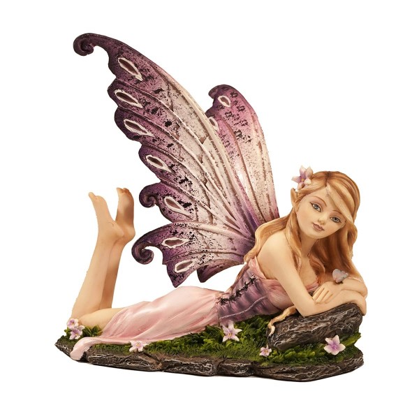 SIGNES GRIMALT Fée allongée, Roche et Fleurs, Couleurs pourpres et Roses, résine Satin Mat, Collection FANTAISY, Hauteur 14 cm