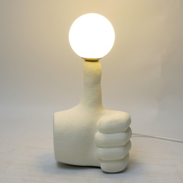 Lampe veilleuse design en porcelaine, poing fermé et sphère lumineuse sur le pouce levée, lampe G9 non incluse, hauteur 28 cm