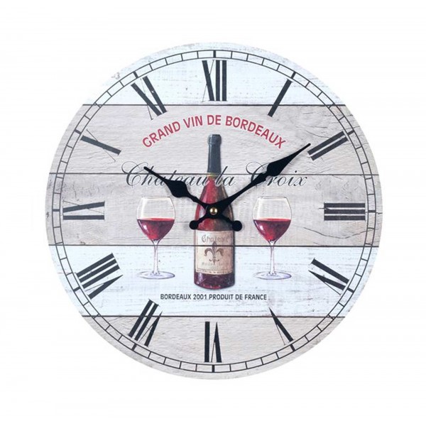 Jolie horloge support Bois MDF sur le thème du vin. Motif Vins de Bordeaux et diamètre 34 cm.