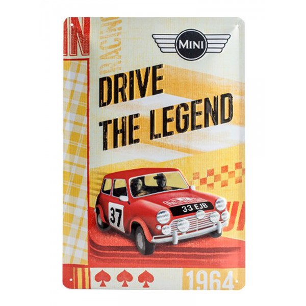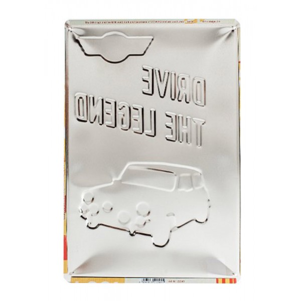 Plaque métallique sous licence officiellle de 30 cm de hauteur et 20 cm de largeur représentant la célèbre Mini en version course et le slogan Drive the legend.