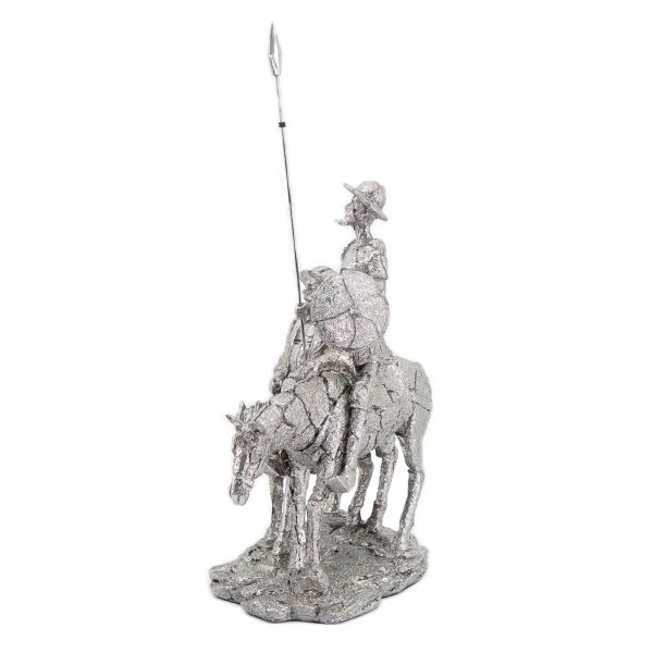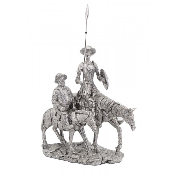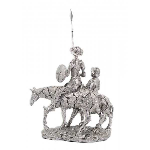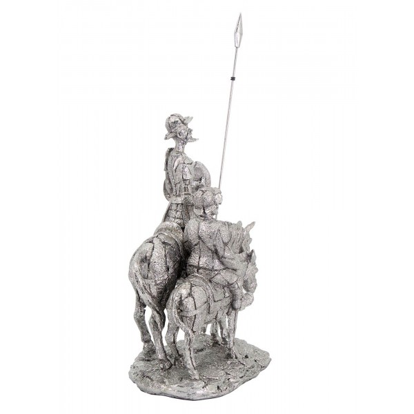 ORIGEN Figurine Don Quichotte à Cheval et Sancho Panza, Finition Argentée contemporaine, L 30 cm
