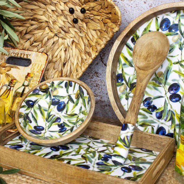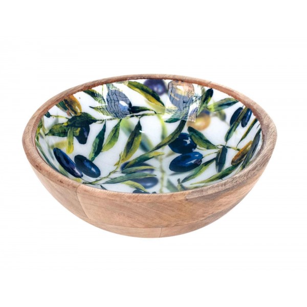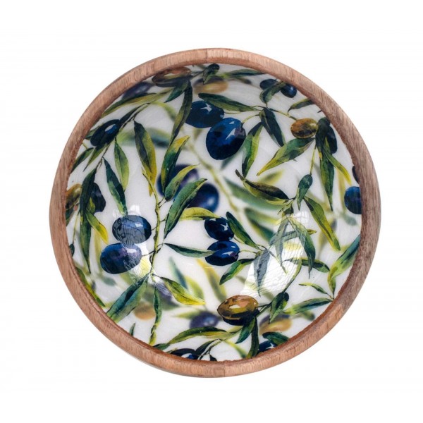 SIGNES GRIMALT Grande Bol, Coupe de service ou vide-poche, Bois de Manguier et Thème Olives de Provence, Diamètre 20 cm.