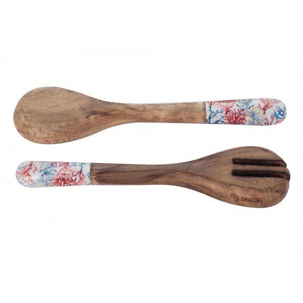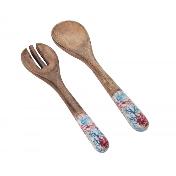 Set de 2 Cuillères en Bois de Manguier : Thème Corail, Bleu et Rouge, H 34 cm.