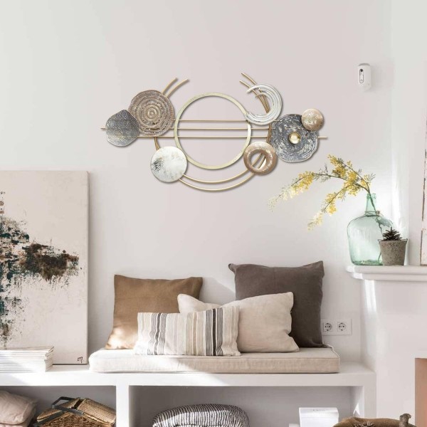 Déco Murale Abstraite : Cerces entrelacés, Disques et Corolles ajourées, Bleu et Or, L 104 cm