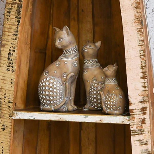 Figurine Chat Assis Bali, Aspect Bois et Motifs stylisés, H 24,5 cm