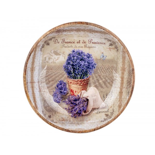 SIGNES GRIMALT Grand Plateau rond en Bois de Manguier : Thème Lavande de Provence. Diamètre 30 cm.