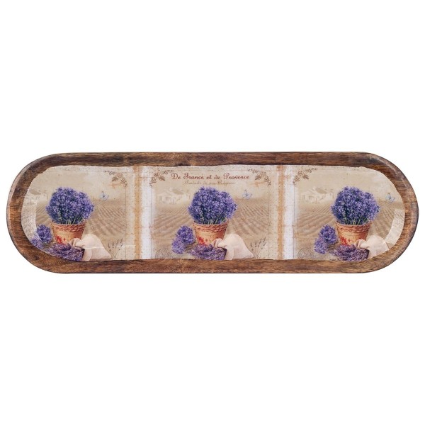 Plateau Apéritif Bords arrondis, 3 Compartiments, Bois de manguier et résine, Thème Lavande de Provence, l 46 cm