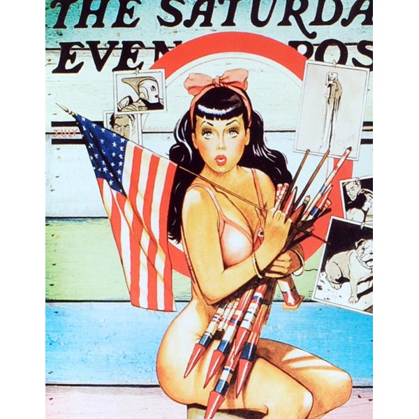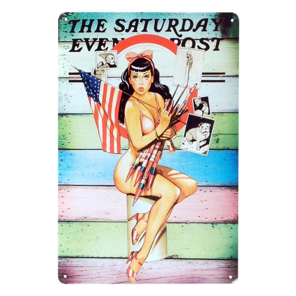 Plaque métal Vintage : Pin up et Fête Nationale USA, H 30 cm