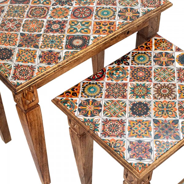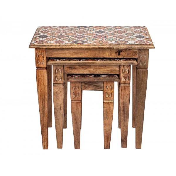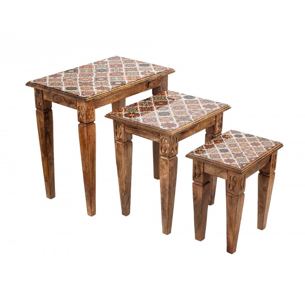 ORIGEN Set 3 Sellettes gigognes en Bois de manguier, Collection Rétro Carreaux de Ciment, H 54 cm (Grande)