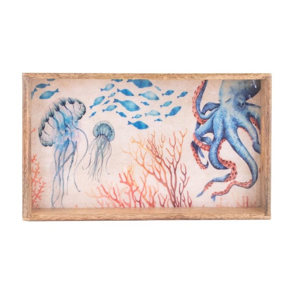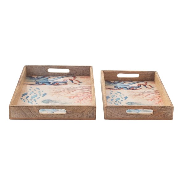 Set 2 Plateaux en manguier et résine, Thème Méduse, Corail et Fonds Marins, Longueur 43 cm (Grand)