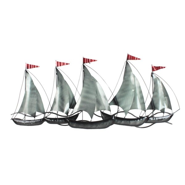 SIGNES GRIMALT Cinq voiliers gris métallisés et drapeaux rouges, 3D métal wallart, Gamme Océanic, longueur 100 cm