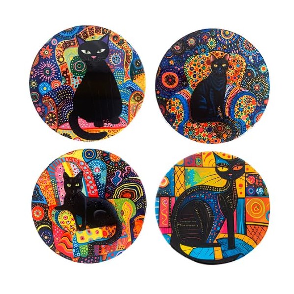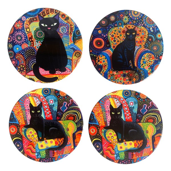 Set 4 sous-bocks en céramique, Chat et Mandalas Ethniques colorés, Diamètre 11 cm
