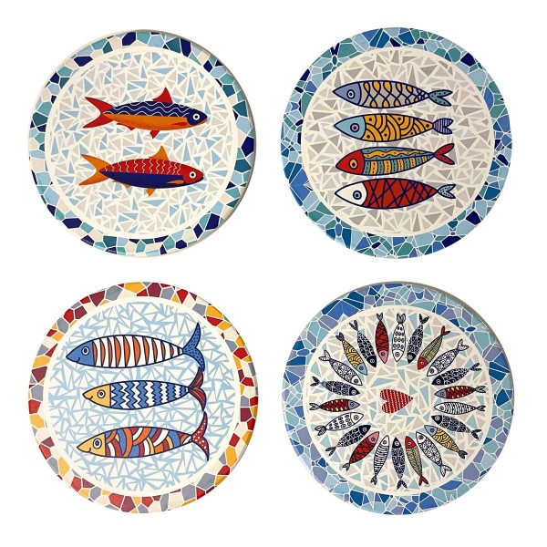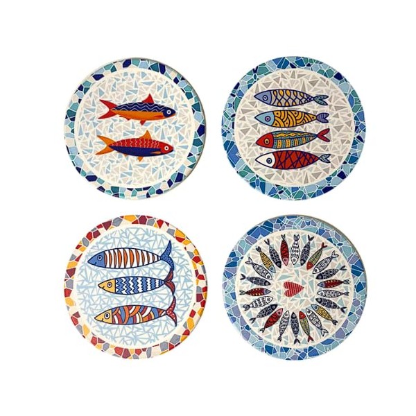 Set 4 sous-bocks en céramique Poisson Sardines, Aspect céramique rétro et coloré, Diamètre 11 cm