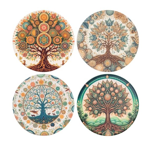 Set 4 sous-bocks Arbres de Vie stylisés et Ambiance Ethnique Originale, diamètre 11 cm