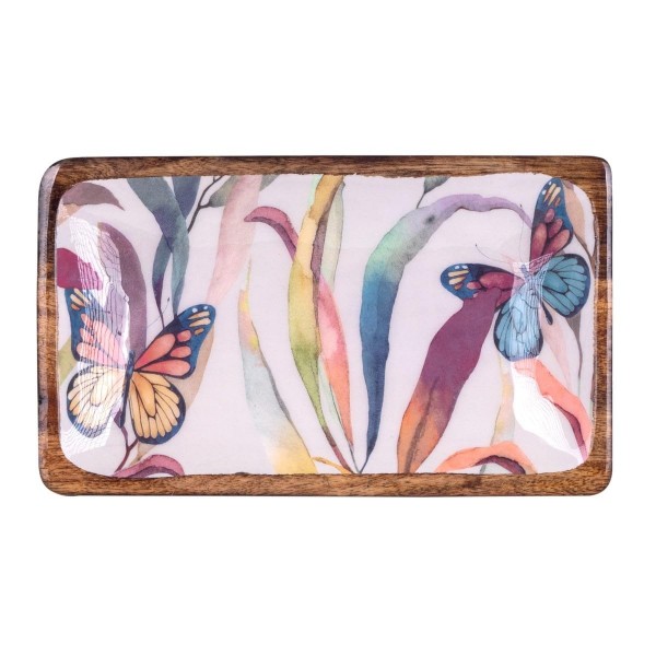 Mini Plateau Bois de manguier et résine, Motif Papillons et végétation Multicolore, Longueur 18 cm
