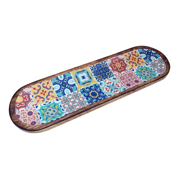 Plateau Long et Bords arrondis, Motif Carreaux de Ciment colorés, Bois de manguier et résine, Longueur 45 cm
