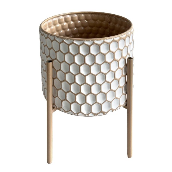 SIGNES GRIMALT Porte-Plante Cache-Pot, Bois et métal, Motif Allover Contemporain, Beige et Blanc, Hauteur 36 cm