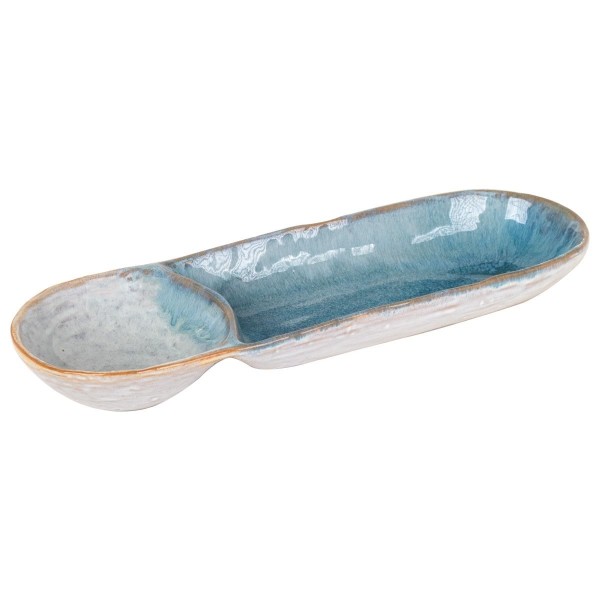 Plateau de Service ou décoratif en grès Bleu, 2 Compartiments, Collection Marine Quimper, Longueur 33 cm