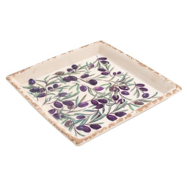 Assiette Plat de service carré en faïence, Effet vieilli et Modèle Olives de Provence, longueur 25 cm