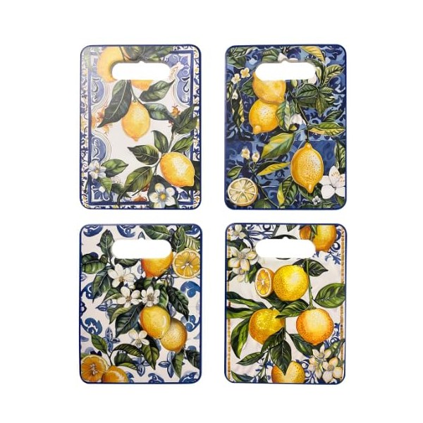 Lot de 4 Planches à Découper en Céramique Motif Citrons & Feuillage – 24 x 18 cm – Décor Méditerranéen Jaune & Bleu