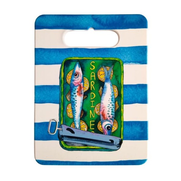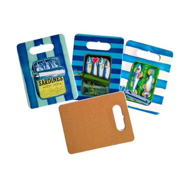Planche à Découper en Céramique Motif Sardines – Série de 4 – 24 x 18 cm – Décor Marin Rayures Bleu – Design Cuisine Bord de Mer