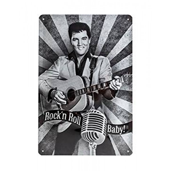 Plaque métallique représentant Elvis Presley jouant de la guitare.