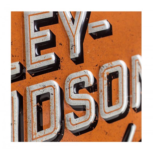 Plaque métallique noire et orange de grande qualité en métal emboutie, avec relief 3D, représentant la marque Harley Davidson avec le nom de la marque, le slogan The original ride, une moto Harley et le logo de la marque.