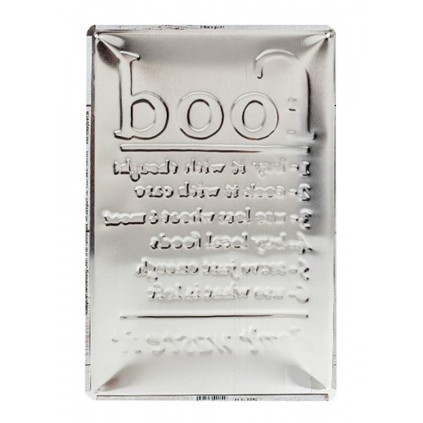 Plaque métallique 3D blanche vintage énoncant les règles de consommations de nourriture.