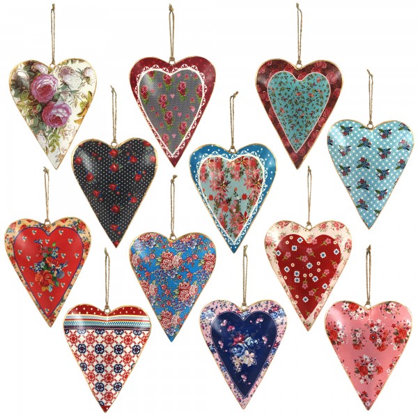 Set 12 Suspensions coeurs métal imprimés, H 16 cm